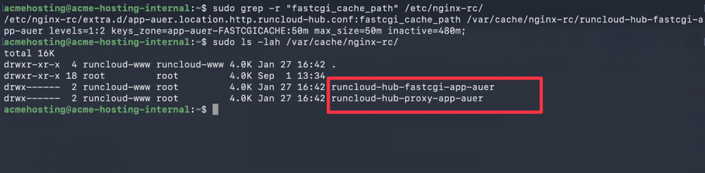 In the above example, we can see there are two different folders present on the server. You can delete the folder you want to clear the cache from. For example, if you want to clear the cache for runcloud-hub-fastcgi-app-auer, run the following command: