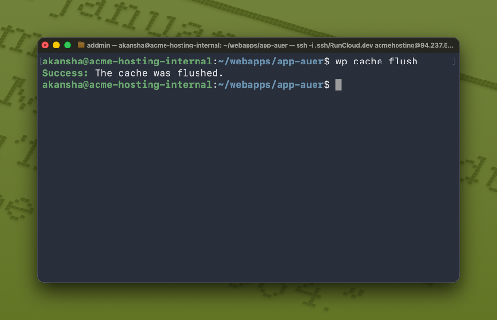 However, if you only want to flush the cache for a particular WordPress site, navigate to your WordPress root directory and run the wp cache flush command. This will clear the object cache for that site specifically, without risking data loss for other applications sharing the same Redis instance.