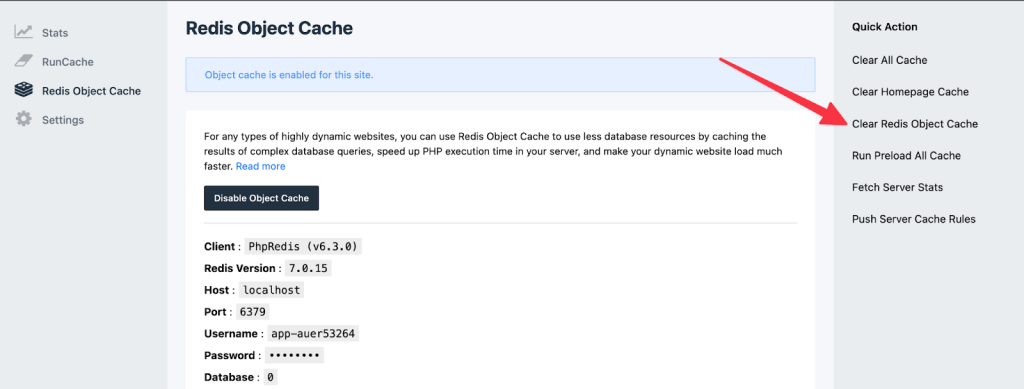 RunCloud offers a much simpler solution that eliminates the need for SSH access or complex commands. You can manage Redis directly from the WordPress Dashboard by navigating to your RunCache settings and clicking the Clear Redis Object Cache button.