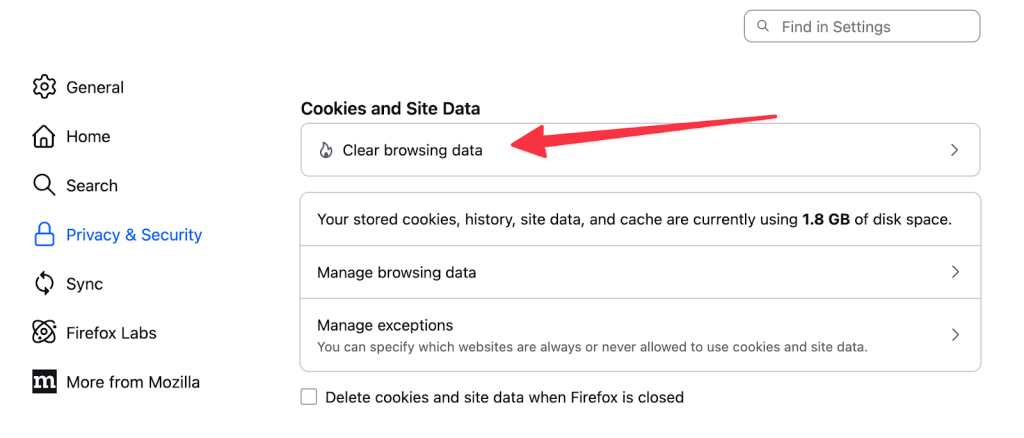 1. Privacy & Security: On the left sidebar, click Privacy & Security. Find the section labeled Cookies and Site Data and click the Clear Browsing Data button.