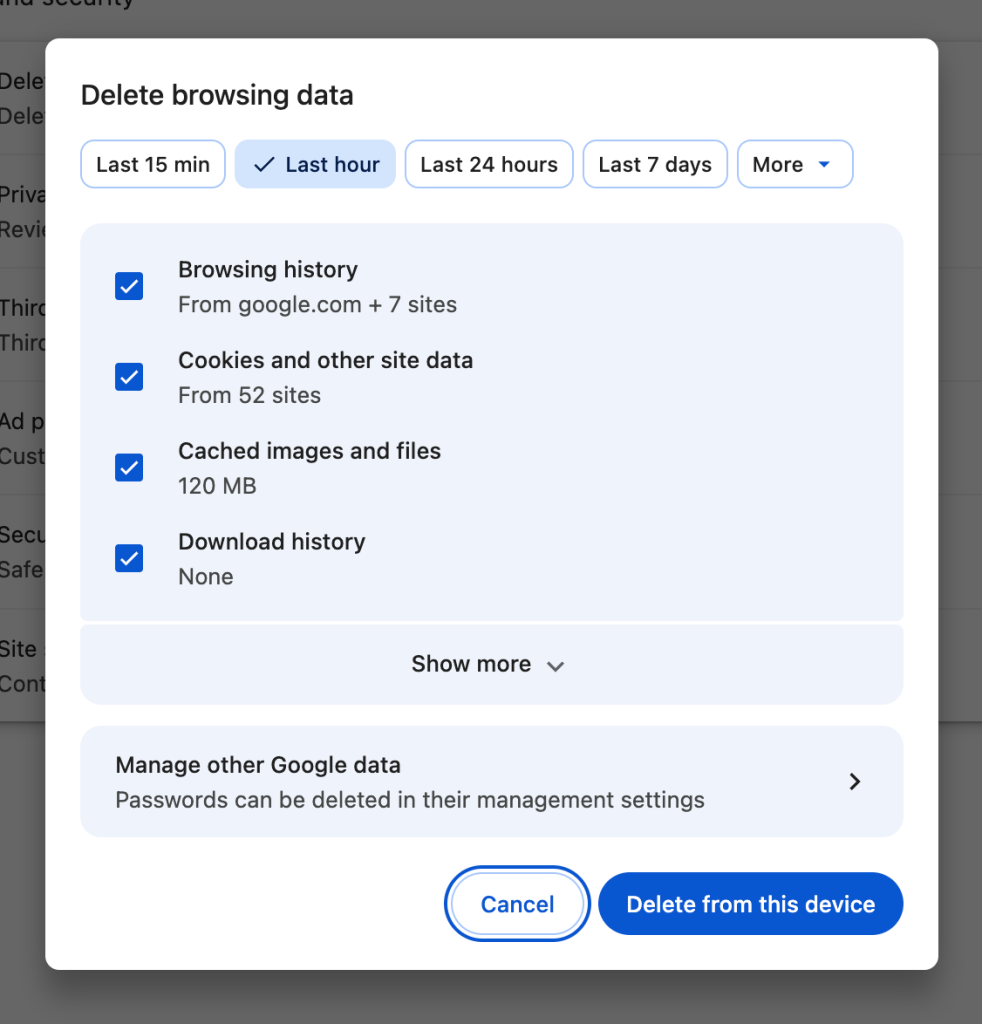 • Checkboxes: Ensure “Cookies and other site data” and “Cached images and files” are selected.