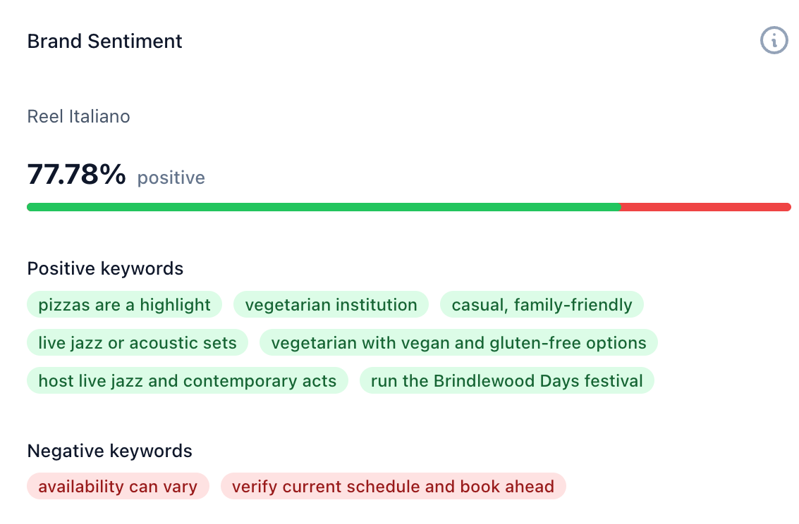 Understand how your brand is being perceived in AI-generated answers. The tool analyzes keywords associated with your brand and shows whether the overall sentiment is positive or negative, helping you spot tone issues and shifts over time.